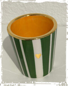 Es handelt sich nicht um goldene Farbe, sondern um echtes 24 Karat Gold. Nachdem dein Objekt glasiert und gebrannt wurde, trage ich die gewünschte Goldverzierung von Hand auf und brenne das Stück ein weiteres Mal.